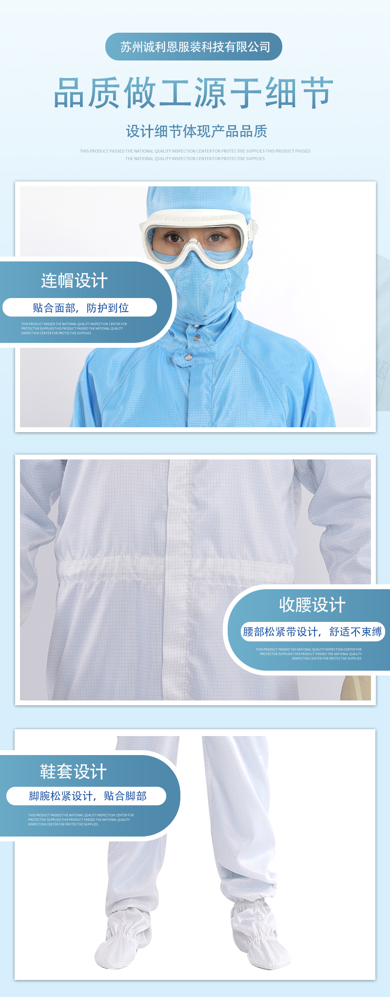 款式說明:四連體,上衣連帽子褲子連腳套;領口暗扣設計,更貼合面部使防護更嚴實。腰部松緊帶或抽繩設計,彎腰不束縛,穿著更為舒適。